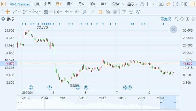 接下来的故事大家都很熟悉:辉瑞/BioNTech疫苗来得又快又好,三期临床试验的最终分析结果显示,其有效性高达95%。 这只疫苗很快在海外获批,欧美多国医护人员、老人等高危群体已经开始了首批接种。 今年以来,疫苗进展牵动人心,疫苗股几乎一直都是市场领头羊,Moderna、辉瑞、诺瓦瓦克斯等几家药企均是疫苗板块的大牛股。 4月:阿帕奇石油 当月涨幅:222%