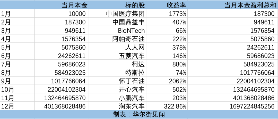 本金一万,假设运气前无古人,每个月的月初买了当月最牛股,月末卖掉,下月初再投入本息,如此循环往复。年终一算,你可能要吓死了——16978亿!