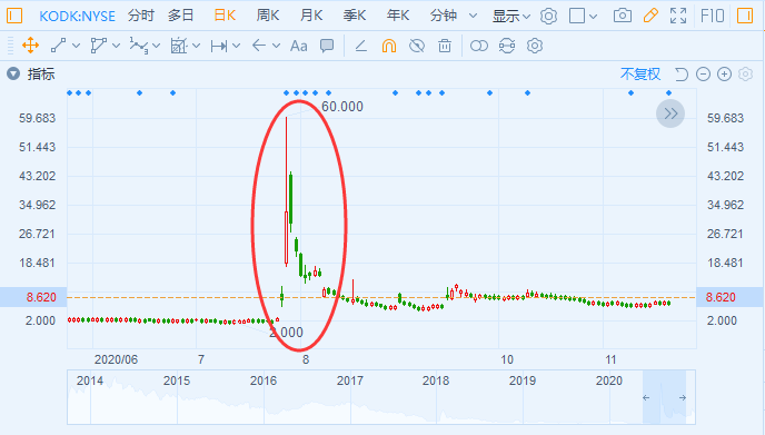这又是一只市场绝不陌生的股票。但它的这一次疯涨,与公司的老本行——胶卷无关。 此时正值美国迎来二次疫情,全球医药股风头正劲。原先专注胶卷研发生产的老牌摄影器材公司柯达意外宣布,将转型制药领域。 当时,美国政府宣布依照《美国国防生产法》给予柯达公司7.65亿美元的贷款,专门用于生产非专利药品的原料,旨在重修美国本土药品供应链,并应对新冠肺炎疫情。特朗普称,这是“美国制药业历史上最重要的一笔交易”。 柯达公司股价当即暴涨,短短几个交易日就拉出了一根该股历史上罕见的超级大阳线。 这只股票不仅三天狂飙近1600%,甚至还在两小时内“熔断”20次,其飞涨速度和势头都是柯达公司2013年摆脱破产后重返纽约证券交易所以来从未见过的。