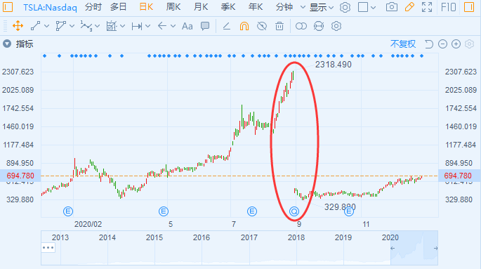 面对今年的疫情冲击,传统车企苦不堪言,新能源车却在特斯拉的带领下一路飞涨,这也是有目共睹的。 特斯拉已经成为美股新“神话”,年内股价涨幅已经超过700%,市值也已大于全球前五大汽车公司的市值总和。 纵观全年,特斯拉的8月涨幅看似微不足道,但就在这个月,这家坐稳全球第一大车企宝座的公司进行了曾在上世纪90年代末风靡、随后又一度沉寂的操作:拆股。 特斯拉当时宣布,将公司股票一拆五,也就是每位股东每持有一股普通股,都将获得四股普通股股息。消息过后,该股股价当天上涨7%,市值也增加了160亿美元。